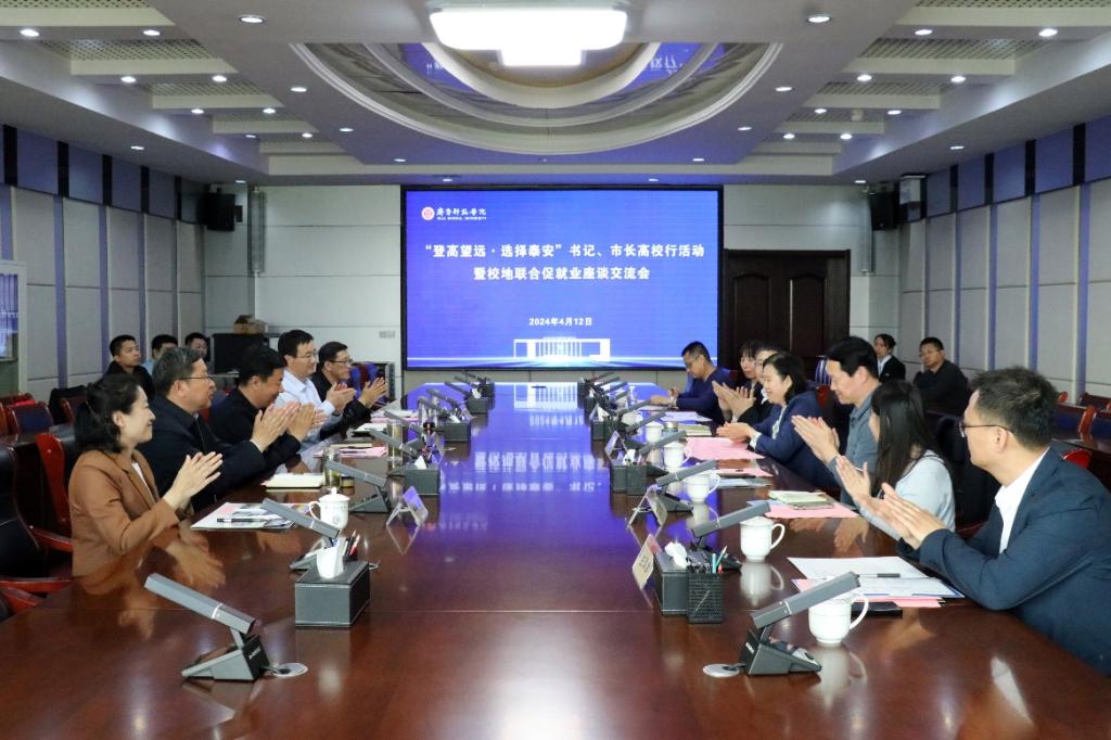 4月13日,“登高望远·选择泰安”书记、市长高校行活动走进188bet金宝搏在线登录。肥城市政府党组成员、副市长孙栋,肥城市委组织部副部长、市人社局党组书记、局长张鹏,肥城市人社局党组成员、副局长赵猛,肥城市安临站镇党委书记王开军一行到校洽谈合作交流。188bet金宝搏在线登录党委副书记赵敏,学生工作部(处)部长朱礼恒,美术学院党委书记辛源,美术学院副院长李冉等出席校地联合促就业交流座谈会。座谈会由朱礼恒主持。