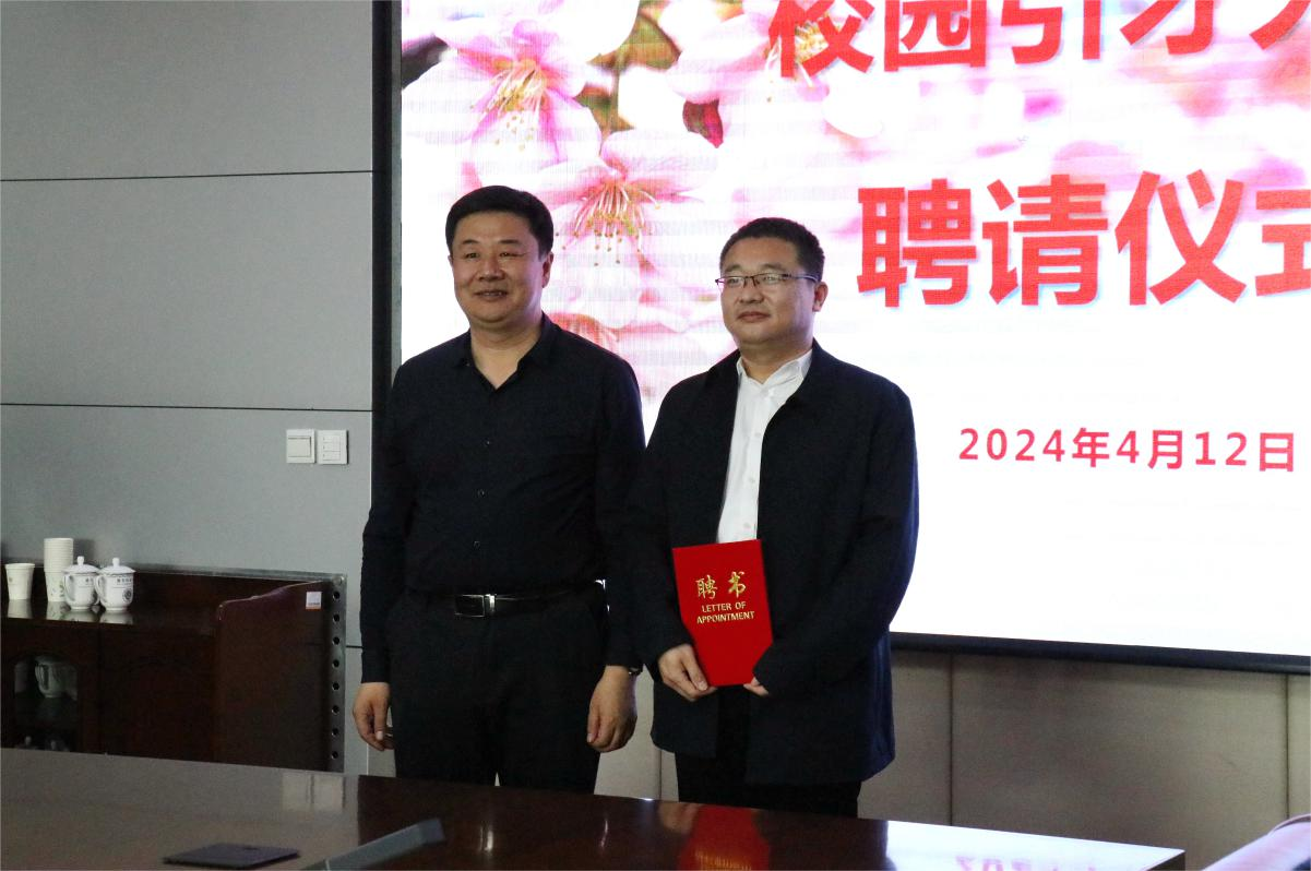 孙栋为美术学院党委书记辛源颁发“校园引才大使”聘书。