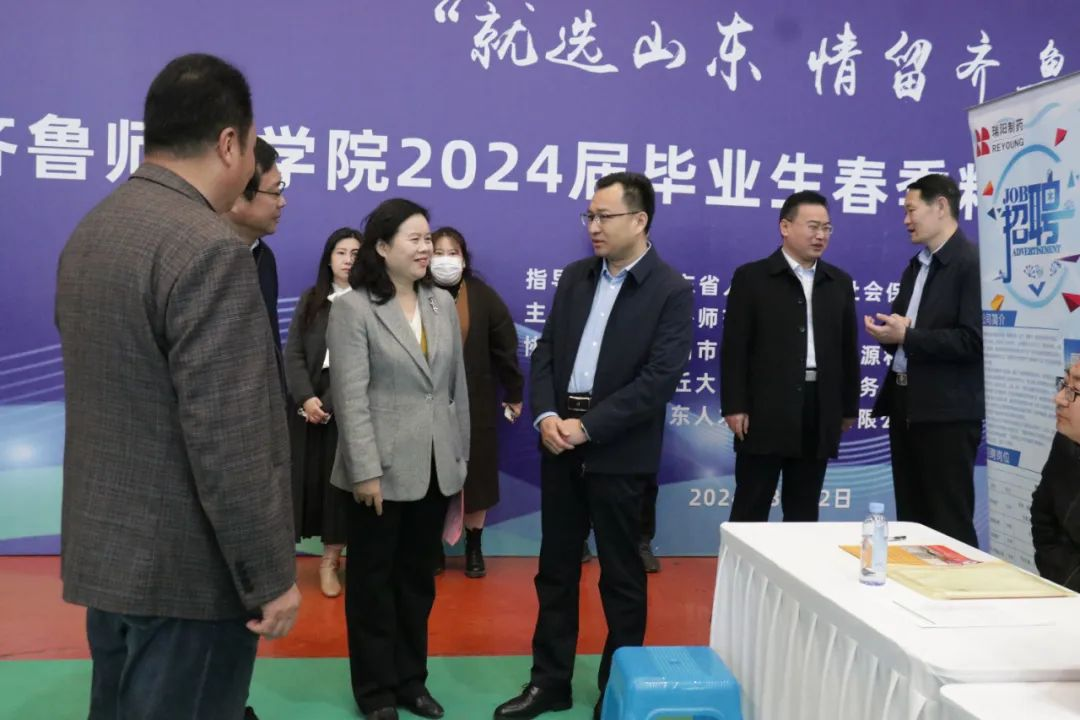 美术学院团总支书记邹少爽,辅导员李玉涛、杨茜带领2024届毕业生来到招聘会现场参加活动,与部分用人单位代表交流了解人才需求和学生投递简历情况,听取用人单位对美术学院人才培养的建议,询问毕业生求职准备及就业意向,有针对性地向毕业生传授求职技巧,鼓励美院学子把握机遇,积极投身于建设社会主义现代化强国的伟大事业中。