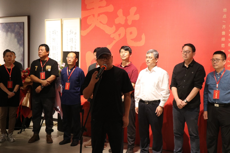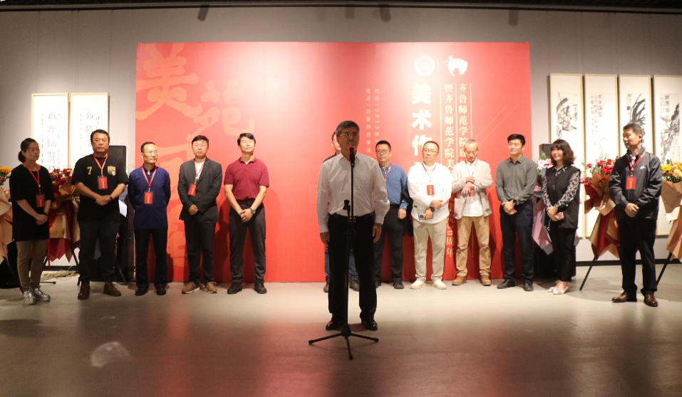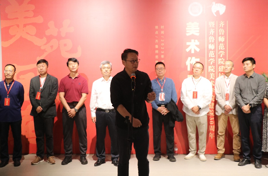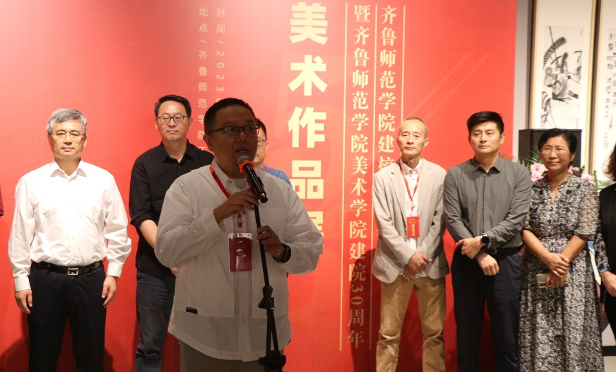 王大海在致辞中赞誉了美术学院特色发展和育人成果,感叹时境变迁、美术学院发展之快,肯定了学校在山东省基础教育和美术教育所作的突出贡献,对展览开幕表示祝贺,并祝愿美术学院续谱新章,更创辉煌。