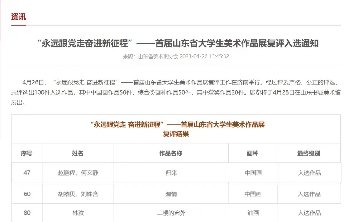 4月26日,“永远跟党走 奋进新征程”首届山东省大学生美术作品展复评结果公布,美术学院2019级美术学专业5名学生荣获佳绩。