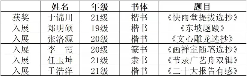 2023年是全面贯彻落实党的二十大精神的开局之年,也是实施“十四五”规划承前启后的关键之年。为紧紧围绕党的二十大关于文化建设的重要部署,贯彻落实省第十二次党代会全面促进文化繁荣兴盛的具体要求,锚定“走在前、开新局”发展目标,以优秀书法篆刻作品展示新时代全面建成小康社会的山东形象,引导新时代大学生把人生追求、艺术生命同国家前途、民族命运、人民愿望紧密结合起来,从当代中国的伟大创造中发现创作灵感、捕捉创新主题,反映时代巨变,188BET金宝搏官网组织书法学同学积极参与由共青团山东省委、山东省书法家协会举办的“永远跟党走 奋进新征程”暨第三届“青莲艺术奖»山东省大学生书法篆刻作品展。