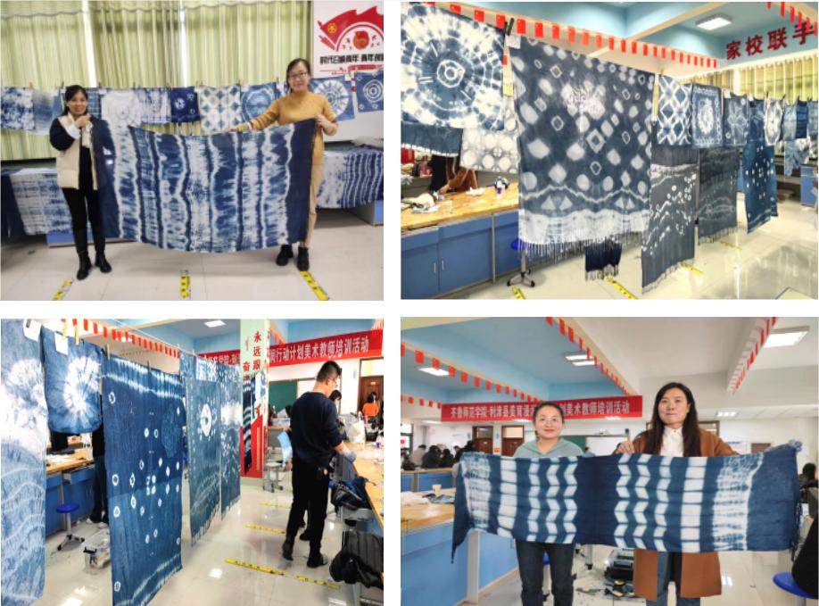 培训中,李晓玉副教授本着培育弘扬、传承创新传统文化的原则,讲授扎染理论、进行教学示范,通过对扎染优秀作品的案例分析,介绍了扎染的传统技艺以及创新设计,并指导学员们进行实践操作,完成作品后结合展示来交流学习收获。系统完善的专业培训,使得学员老师们在学习扎染技艺的同时,又切身感受扎染工艺之美。