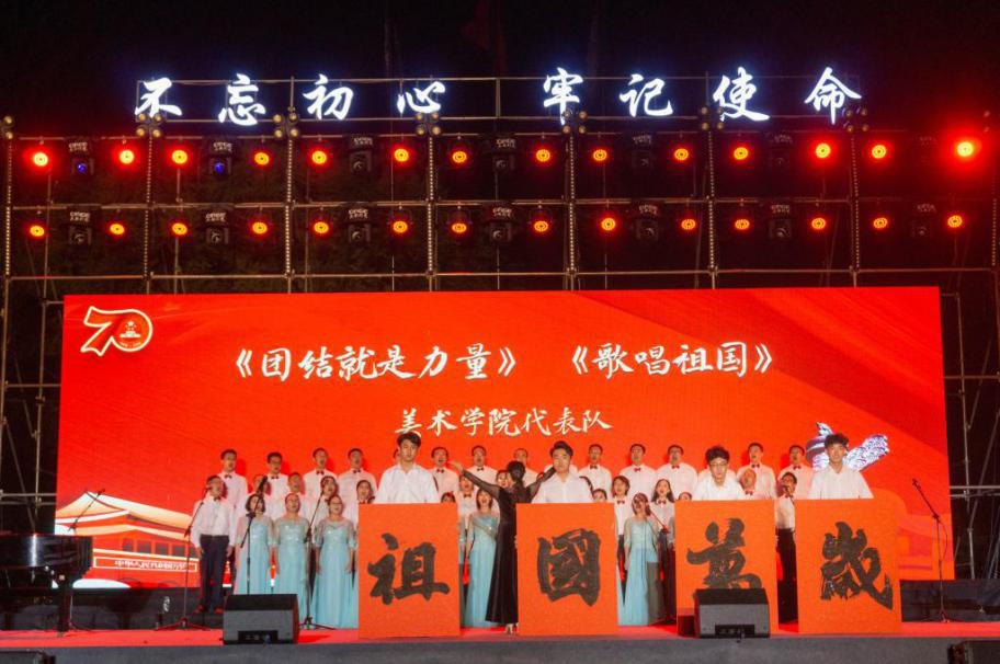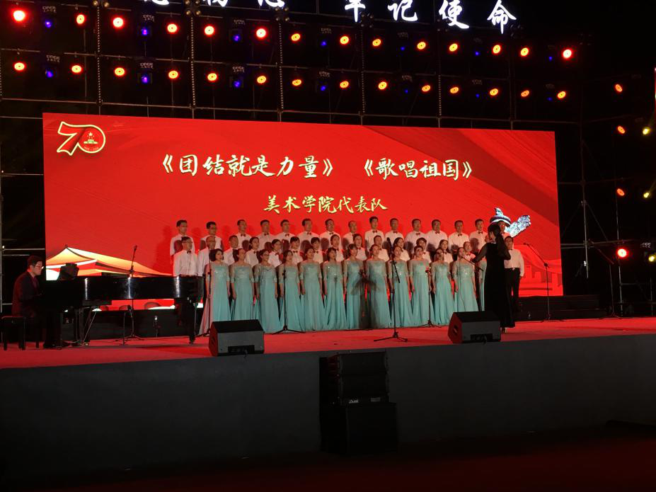金秋时节,丹桂飘香。为庆祝中华人民共和国成立70周年,进一步推动“不忘初心、牢记使命”主题教育的深入开展,9月24日晚,我校在章丘校区隆重举行了“不忘初心 牢记使命 唱响新时代”庆祝中华人民共和国成立70周年教职工合唱比赛。美术学院全体教职工积极投身到比赛中去,我们热情饱满,我们慷慨激昂,我们团结奋进。