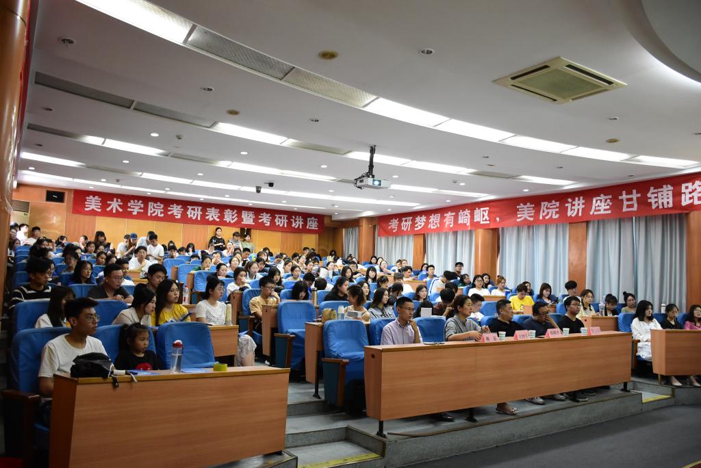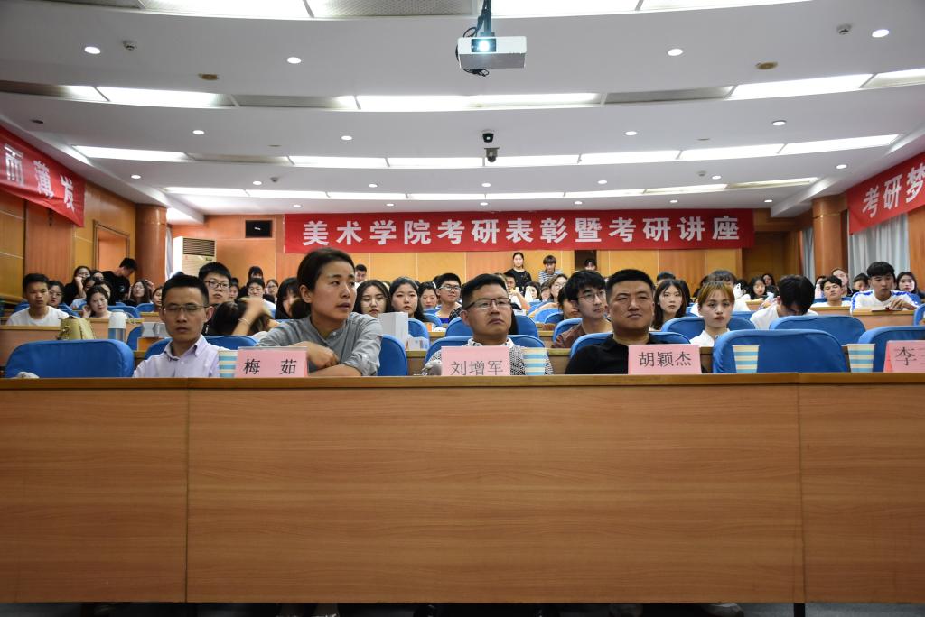 与会领导老师为受表彰同学颁奖。葛超、闫强、郝雨、孙丽萍和邢国庆五位考研成功的同学分别代表书法学、美术学(国画、油画、设计)专业,从考研的意义、选择考研的时机、各科考试的复习技巧、考研专业和报考学校的选择等几方面向同学们传授考研经验。现场气氛热烈,座无虚席。