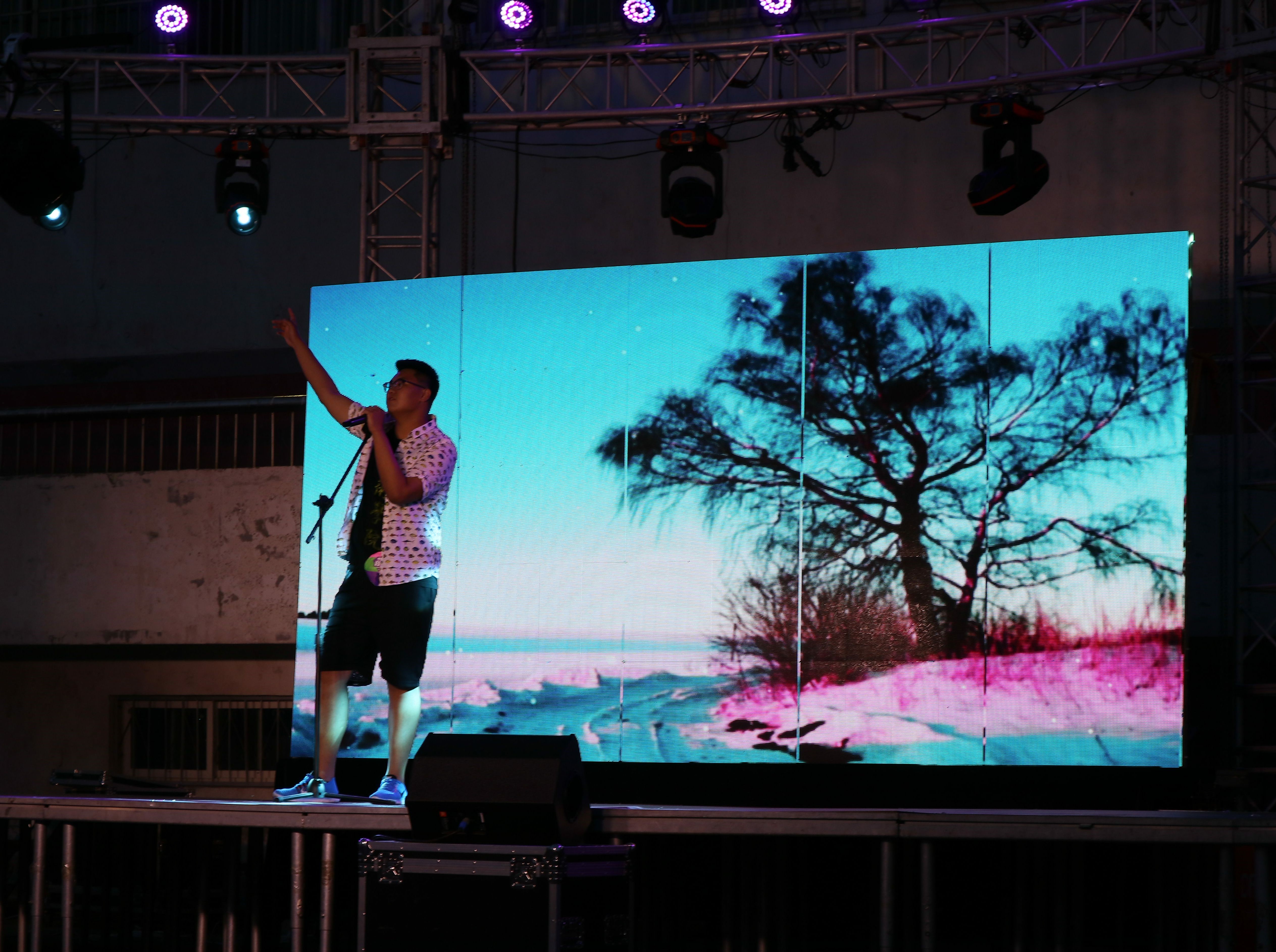 比赛于晚上7点进行。赛前半小时,同学们被参赛者排练的美妙歌声所吸引,纷纷前来观看,大家都期待着这场音乐盛宴。比赛开始,领导老师们入席,20位参赛者在台下等候,在演唱者演出时,其他参赛者仍不忘在台下排练,为本次音乐节做好充分准备。